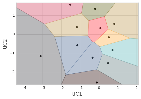 _ = msme.plot_voronoi(clusterer, xlabel='tIC1', ylabel='tIC2')
