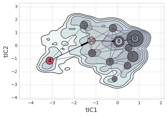 _ = msme.plot_msm_network(msm, pos=pos, node_color='carbon',