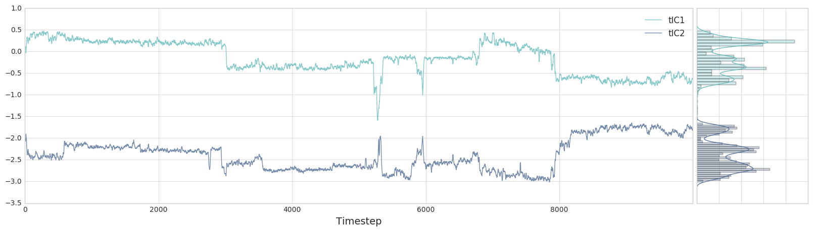 tica_model = tICA(lag_time=10, n_components=2, kinetic_mapping=True)
